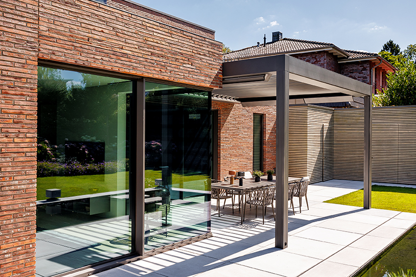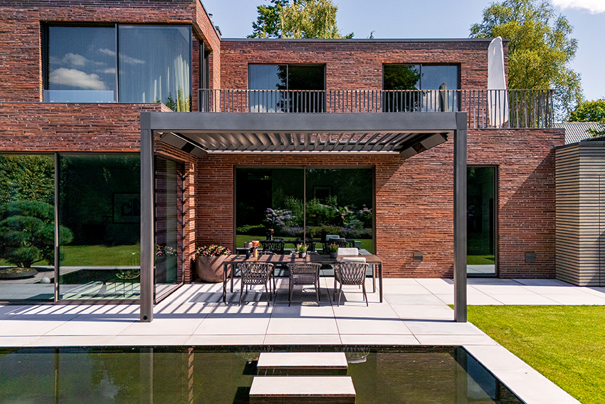 Eine Renson Überdachung für ein modernes Haus mit einer großen Terrasse – ein Paradies ist entstanden und lässt keine Wünsche offen! Dank ausführlicher Planungsgespräche und modernsten Gestaltungs-Tools konnten wir unseren Kunden dabei unterstützen, seinen perfekten Garten zu kreieren. Das bewegliche Lamellendach sowie der ausfahrbare Sonnenschutz ermöglichen eine genaue Regulierung der Sonneneinstrahlung – oder Schutz vor Wind und Regen.